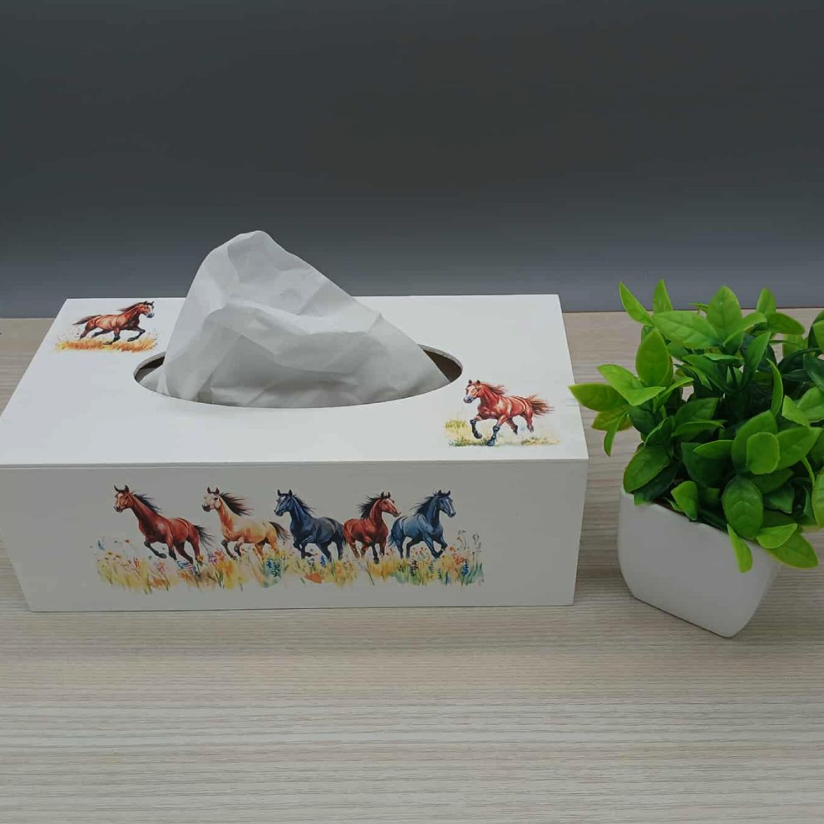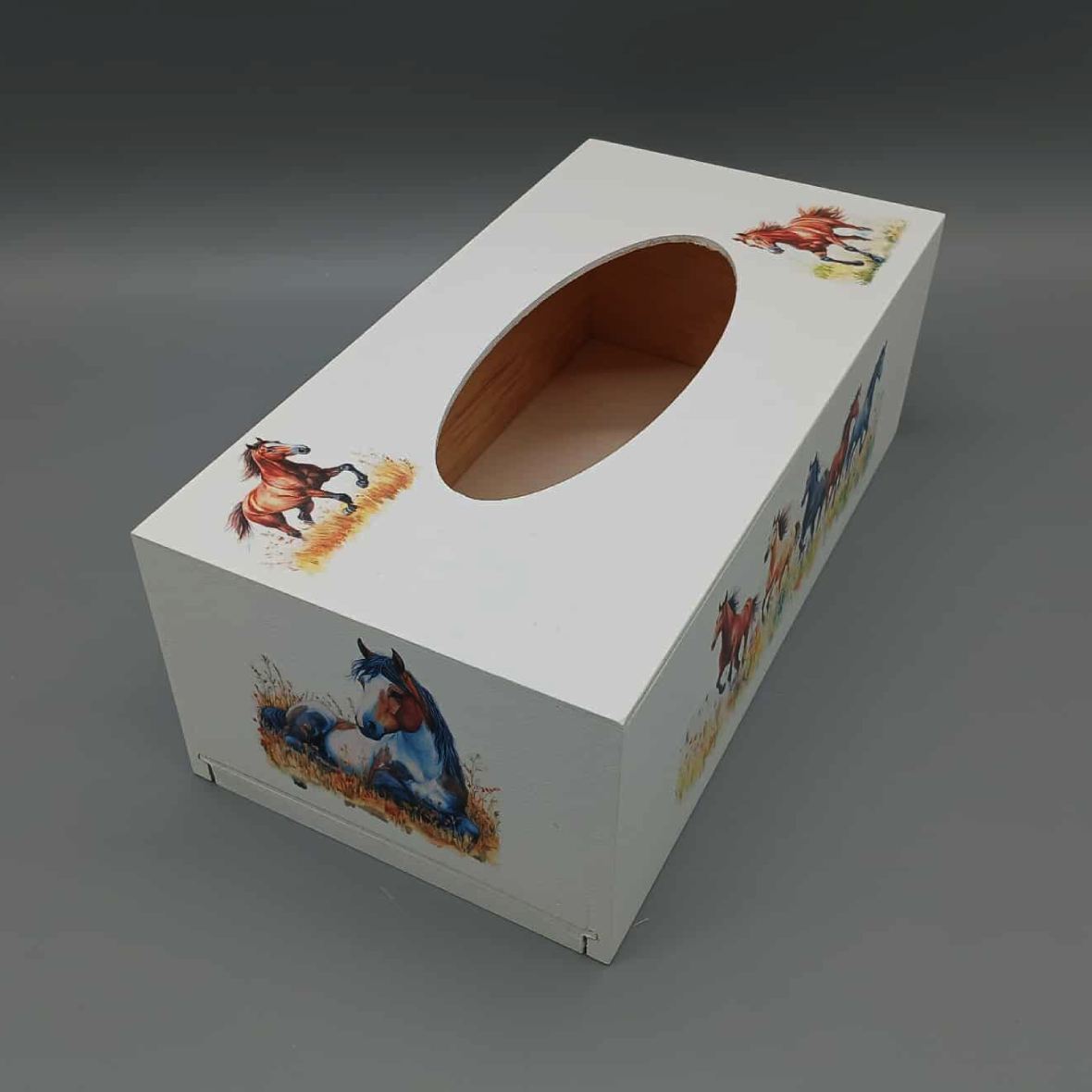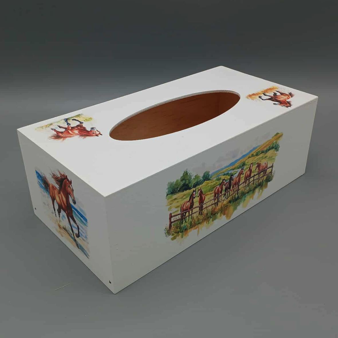 Boîte à mouchoirs décorée de chevaux en pleine nature. Des scènes équestres au galop ou au repos, pour une déco chaleureuse, rustique et pleine de liberté.