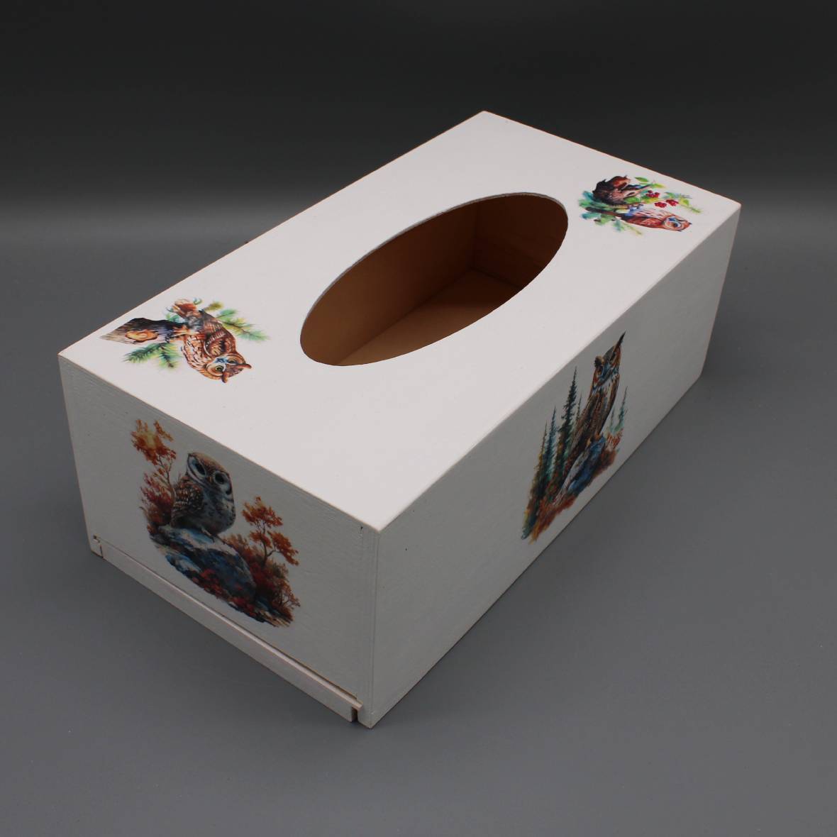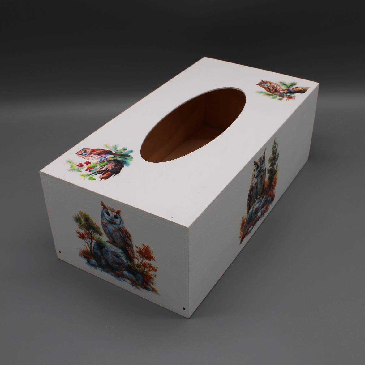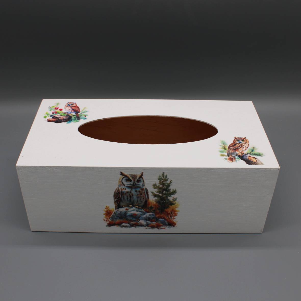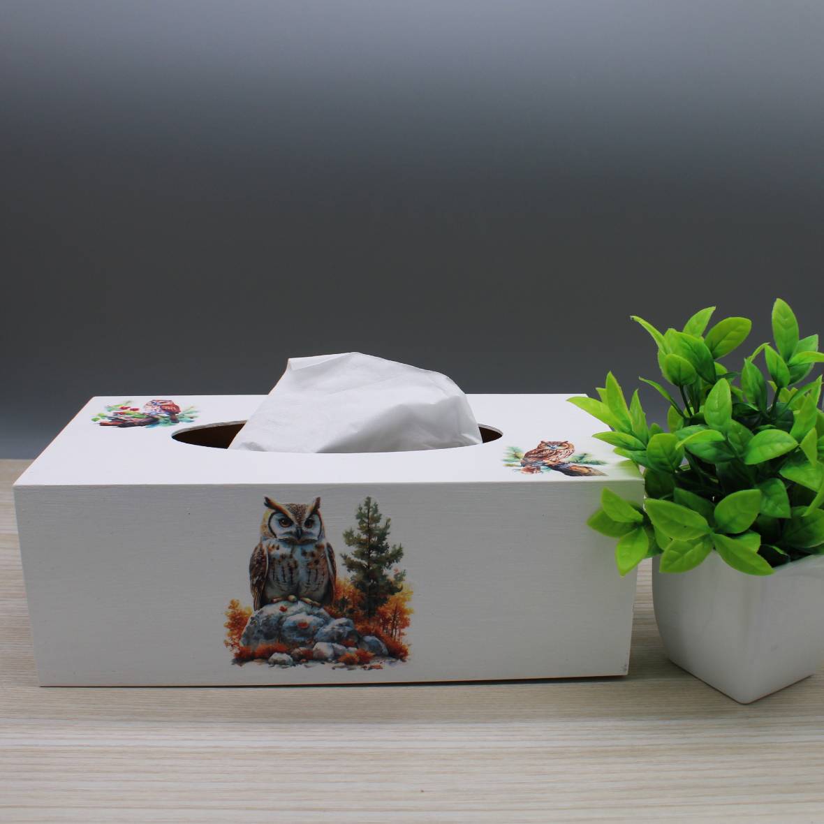 Boîte à mouchoirs en bois décorée de chouettes et hiboux dans un style aquarelle doux et forestier. Un objet décoratif parfait pour une ambiance nature et chaleureuse.
