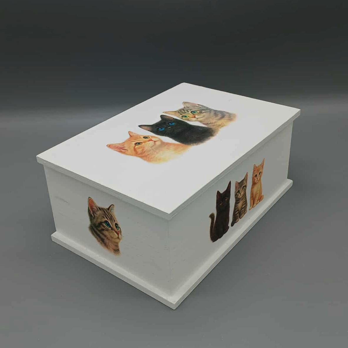 Boîte à trésors « Chatons » en bois peint et décorée par transfert d’image. Intérieur en suédine blanche, finitions soignées. Un objet tendre et élégant, parfait pour bijoux ou souvenirs.