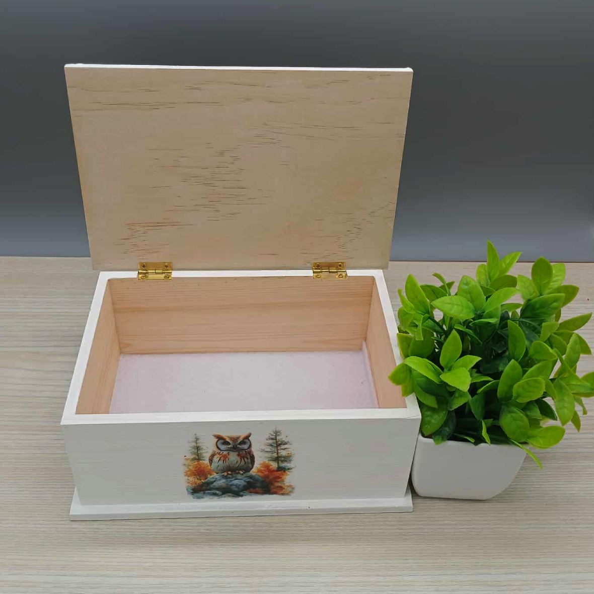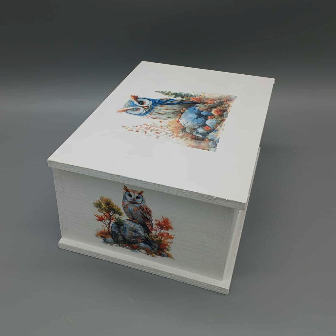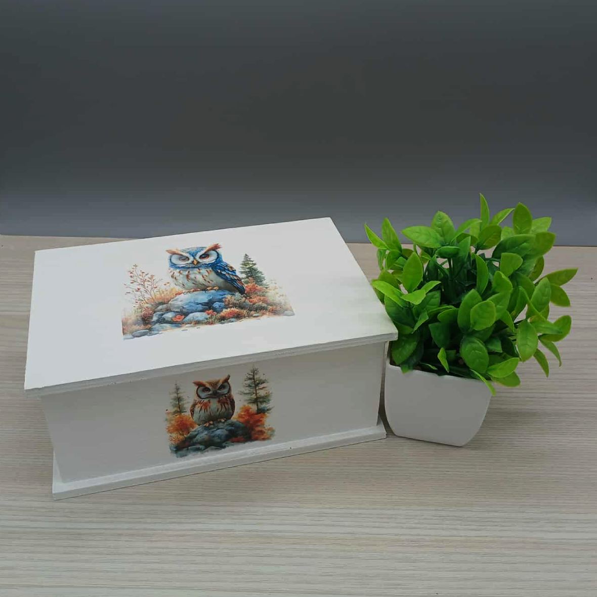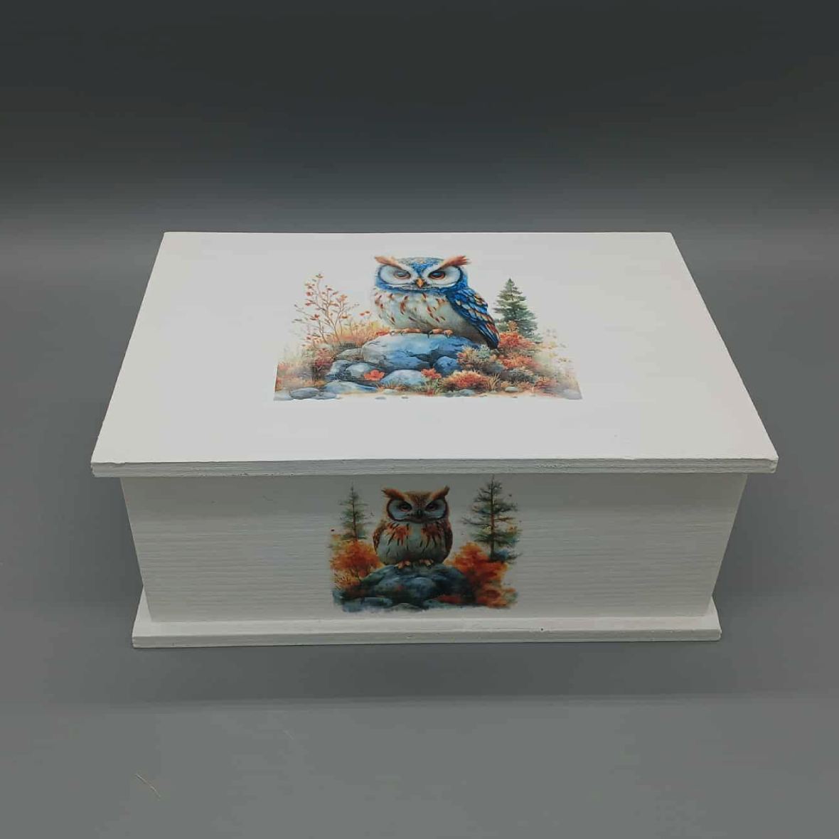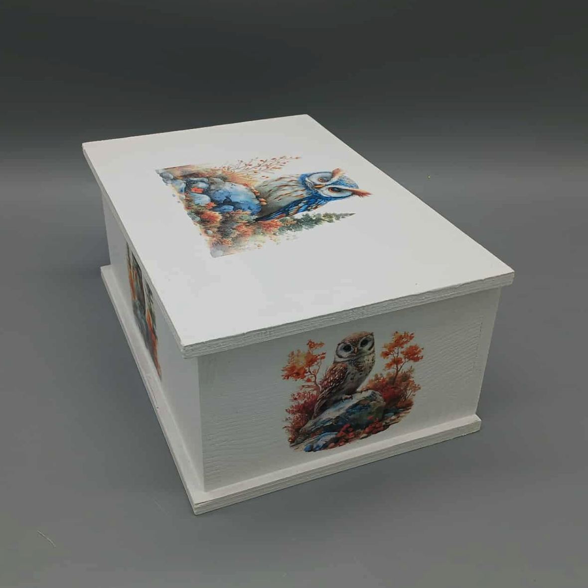 Boîte à trésors en bois décorée de chouettes dans un décor forestier automnal. Une pièce poétique et pratique, parfaite pour bijoux, souvenirs ou objets précieux.