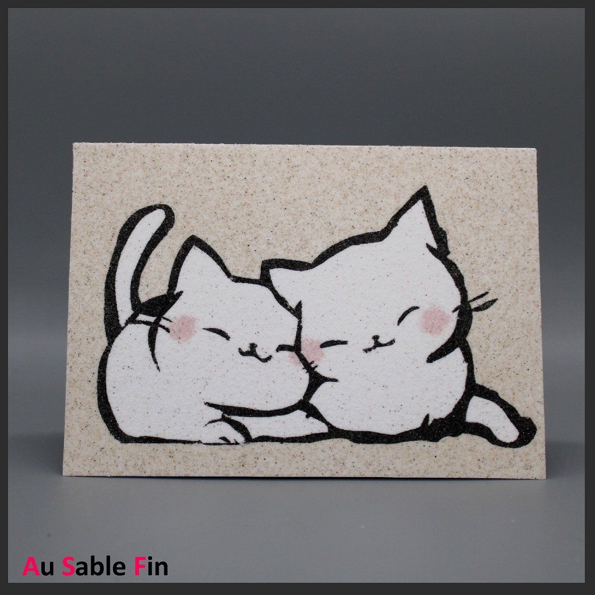 Carte « Chats Kawaii » : tableau de sable montrant deux chatons blancs enlacés, format 15 x 10,5 cm, enveloppe et pochette incluses. Partagez un instant de douceur !