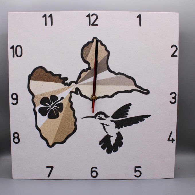 Horloge carrée illustrant la forme de la Guadeloupe, une fleur d’hibiscus et un colibri. Sables naturels (Fontainebleau, Maroc, Bretagne, Côte d’Opale, Tunisie, Espagne, Seychelles) et sable noir. Mécanisme silencieux.