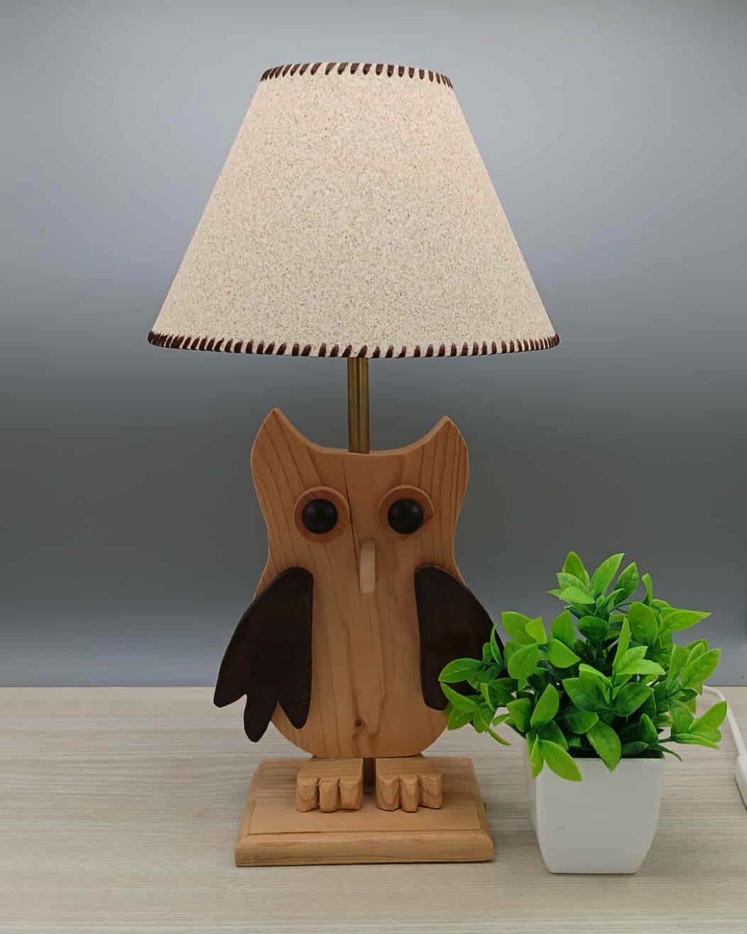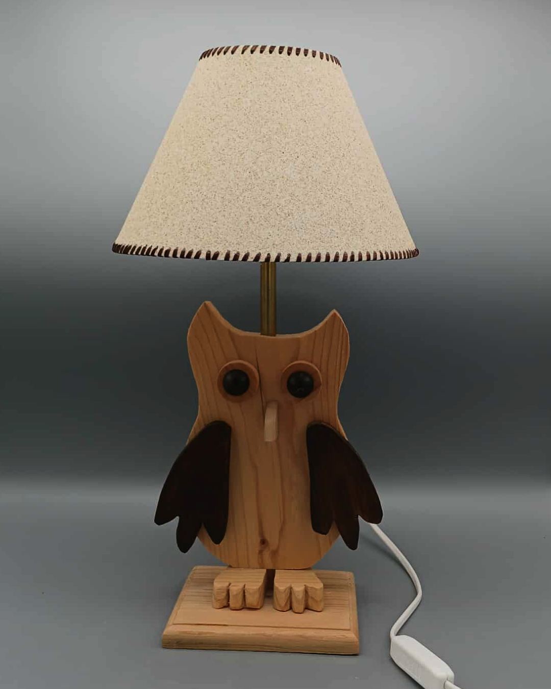 Lampe artisanale “Chouette Élégante” en bois réalisée à la main, abat-jour en sable naturel du Portugal. Hauteur 38 cm, câble 2 m, douille E27. Une création unique mêlant douceur, nature et artisanat.