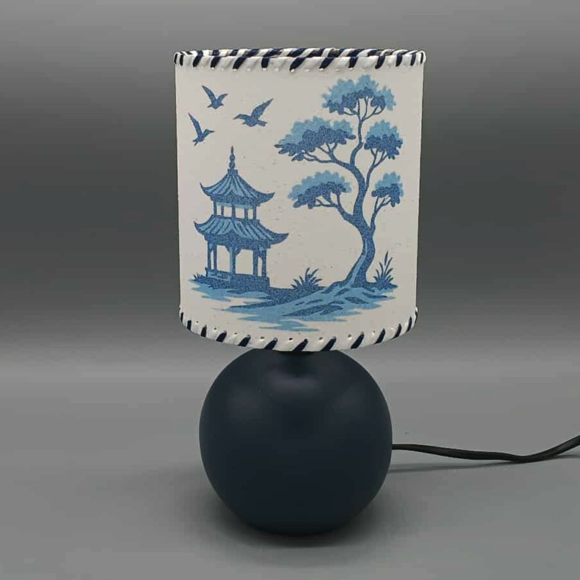 Lampe artisanale “Jardin Zen” : abat-jour sablé bleu représentant une pagode et des oiseaux en vol. Pied en céramique bleu nuit. Une touche de calme et d’élégance venue d’Asie.