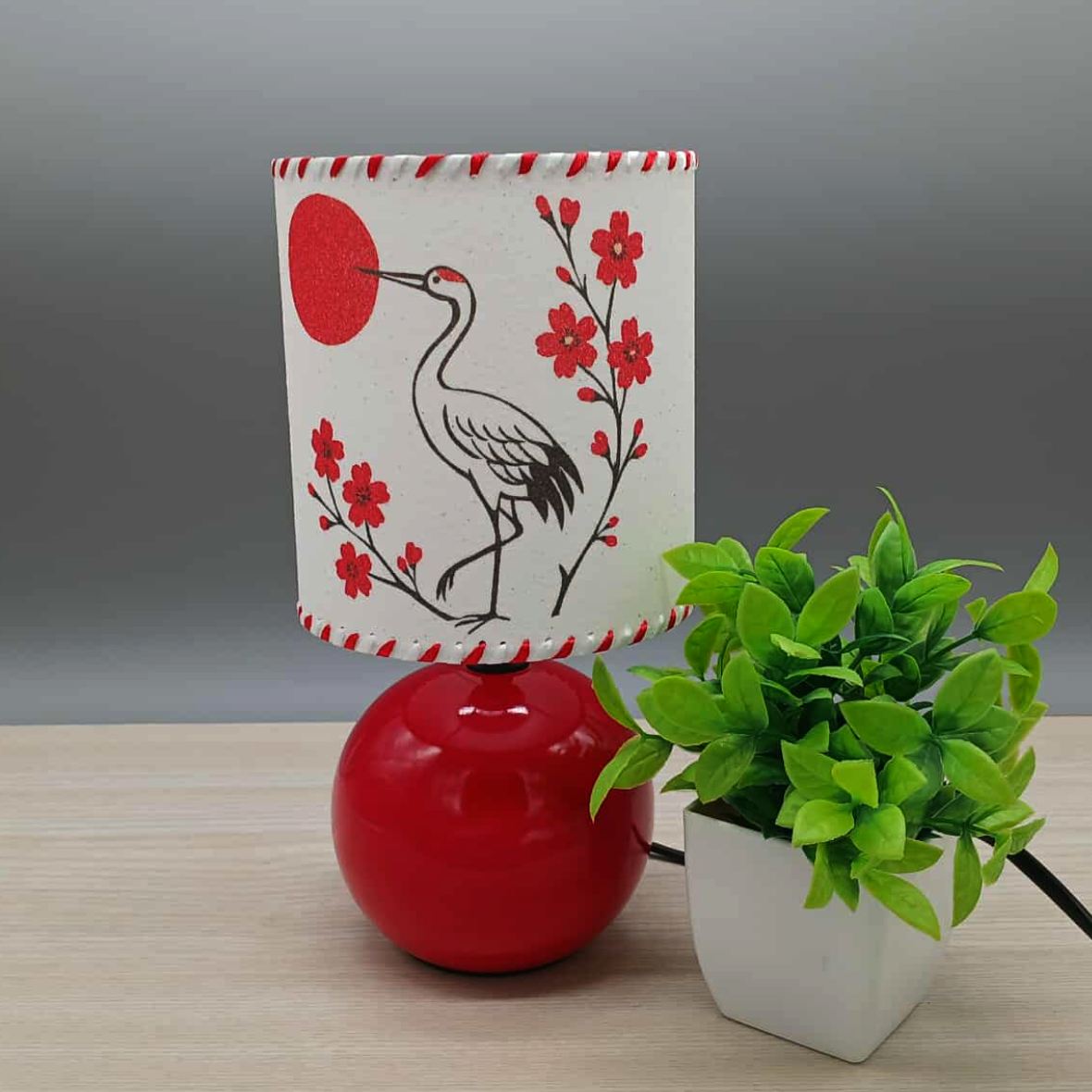 Lampe artisanale “Soleil du Japon” : abat-jour sablé rouge, noir et blanc représentant une grue et des fleurs de cerisier. Pied en céramique rouge brillant. Une touche zen et lumineuse inspirée du Japon.