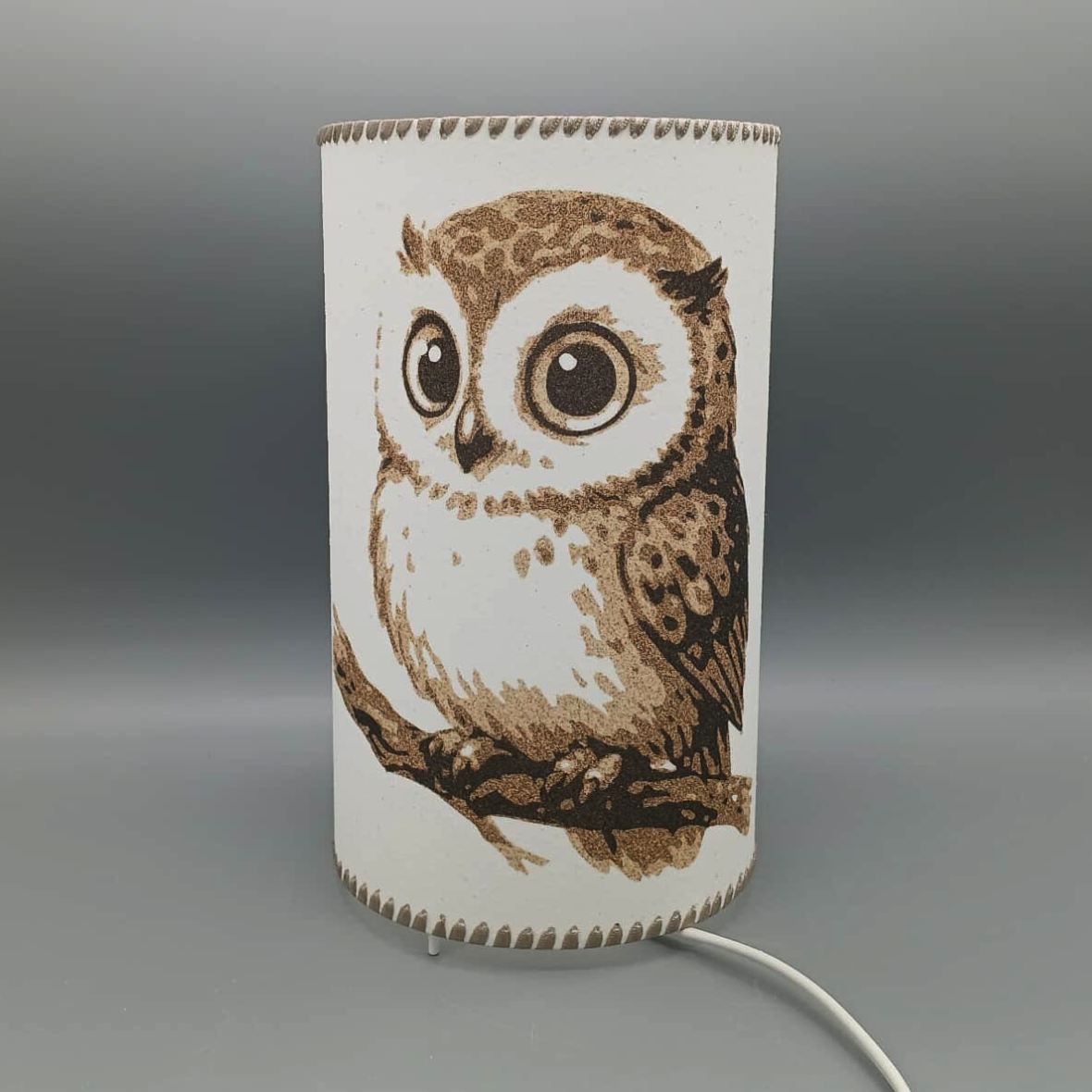 Lampe cylindrique artisanale décorée d’une chouette sablée à la main en tons bruns et écrus. Ambiance douce, chaleureuse et naturelle. Idéale pour un salon, une chambre ou un coin lecture.