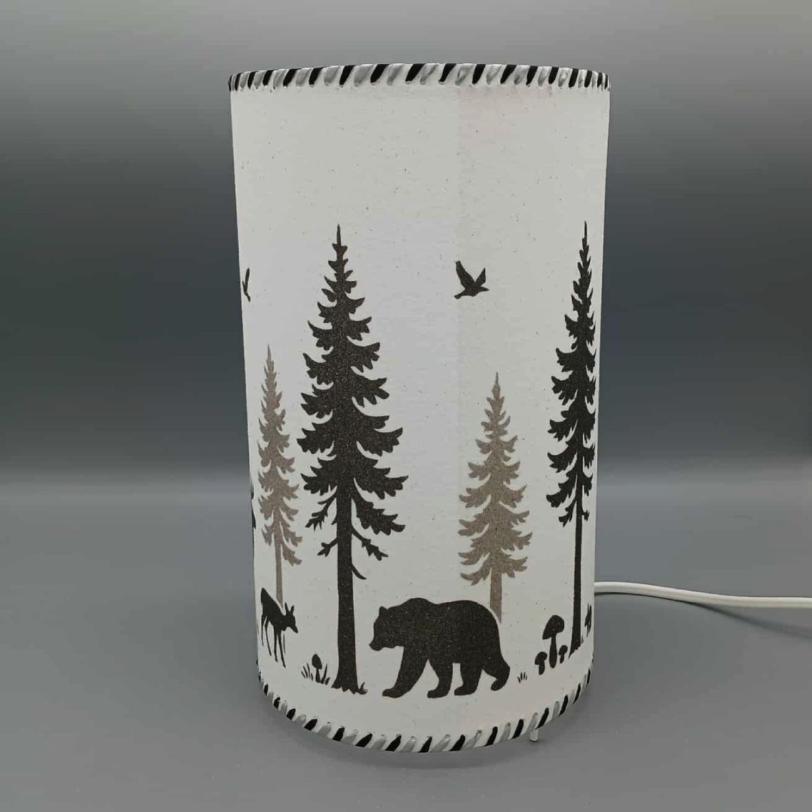 Lampe cylindrique « Forêt boréale » en sable naturel. Loups, cerfs et ours sous les sapins, tons noir et gris sur fond blanc. Fabrication artisanale, lumière douce et apaisante.
