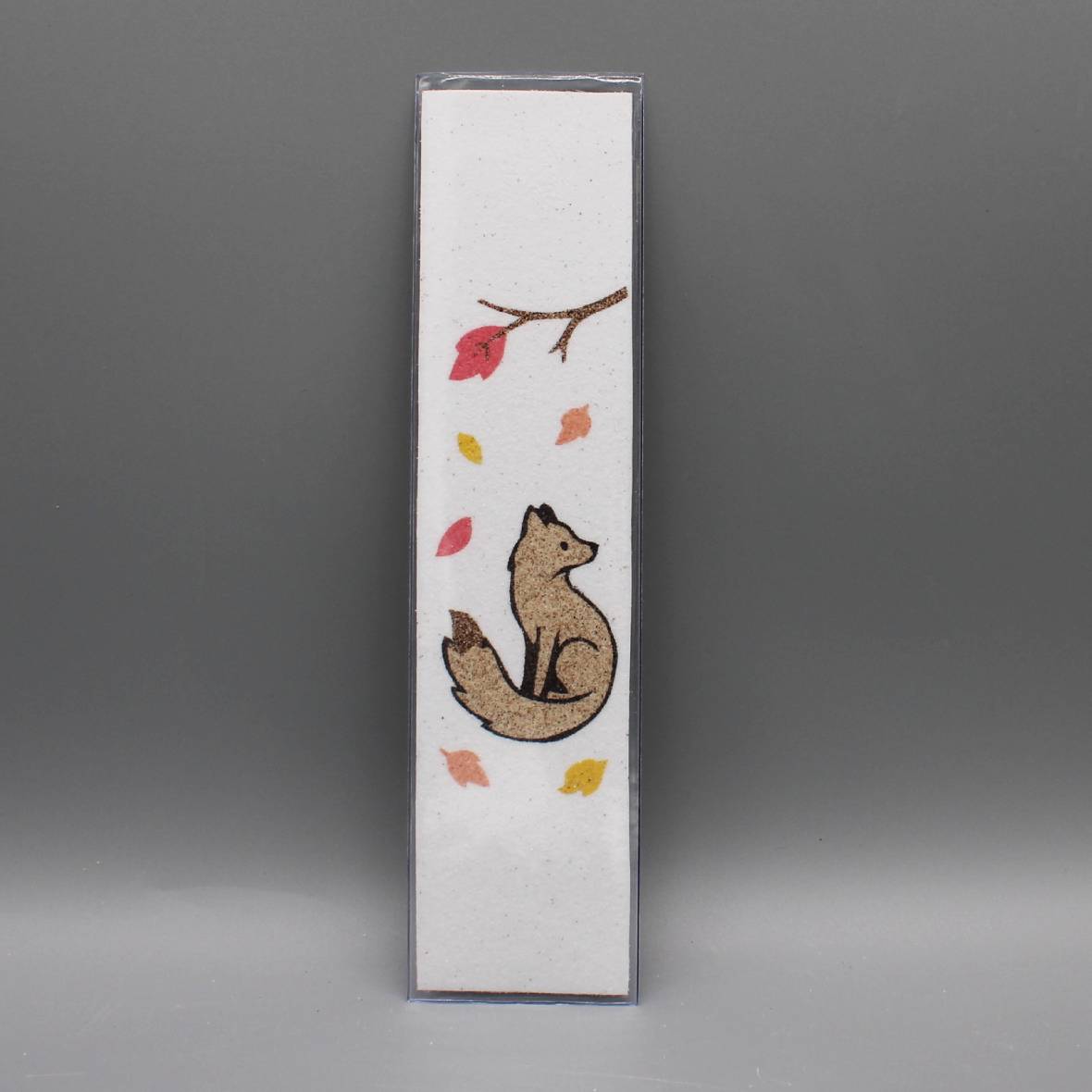Marque-page « Renard » en tableau de sable naturel du Maroc, protégé par une housse plastique, pour des lectures empreintes de nature.